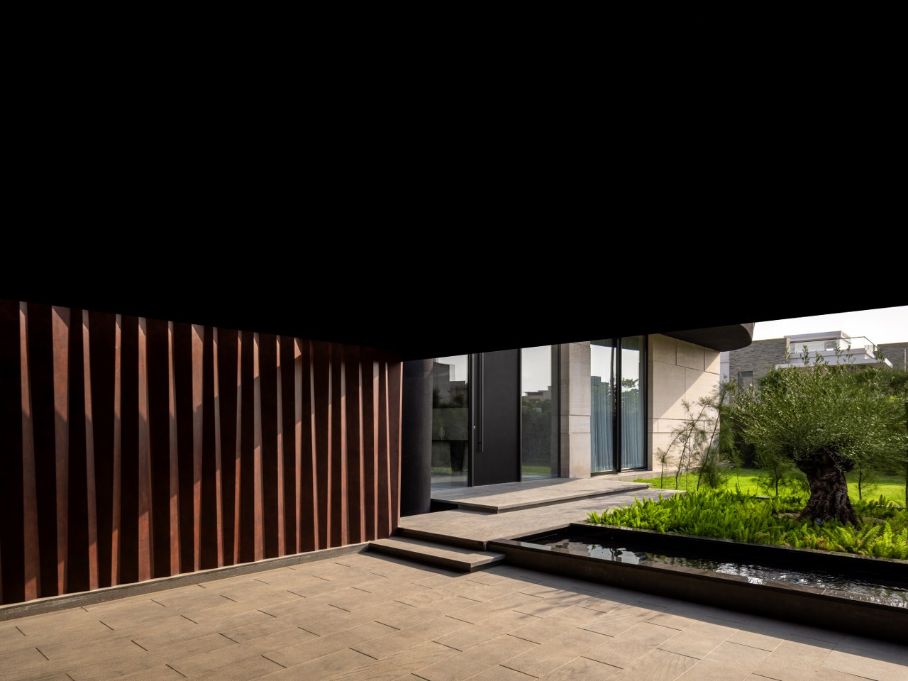 You walk over it on a precisely placed stone pathway, each step intentional, each movement grounding. Beside it, a sculptural canopy rises, a quiet architectural metaphor signaling the home’s underlying philosophy: fluidity, lightness, and Pathway to Stillness. This processional sequence culminates at a double-height entrance foyer: design elements that are calm, centered, and contemplative.
