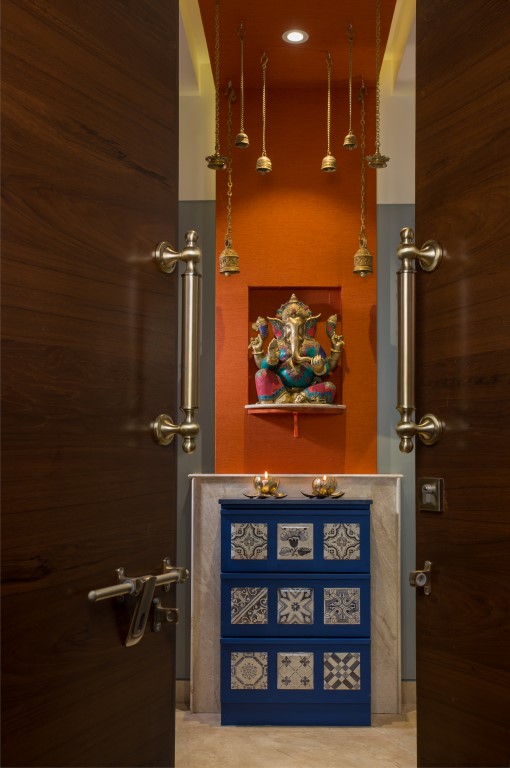 The “Blue Door” at the entrance is infused with metal Jali work and it gives you a peek of the natural veneered wooden door inside. Once inside, Lord Ganesha greets you, with a beautiful feature wall as the backdrop. A slab of Quartz Marble supports the 21 kg idol, which was acquired from Mangalore and embellished with “Meenakari work”. An indigo chest of drawers sits at the base of the wall cladding with hand-made tiles complementing the tangerine orange raw silk panel and suspended brass bells, which gives the space a period look. The Lord Ganesha handles are custom cast in brass.
