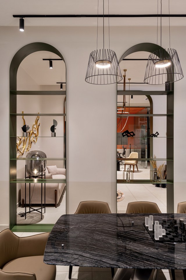 Minimalism and design thinking guided the process, understood here not as absence but as clarity. Metal frames became the defining language – slim and deliberate, forming partitions, shelving, and archways that seemed to float within the shell.
