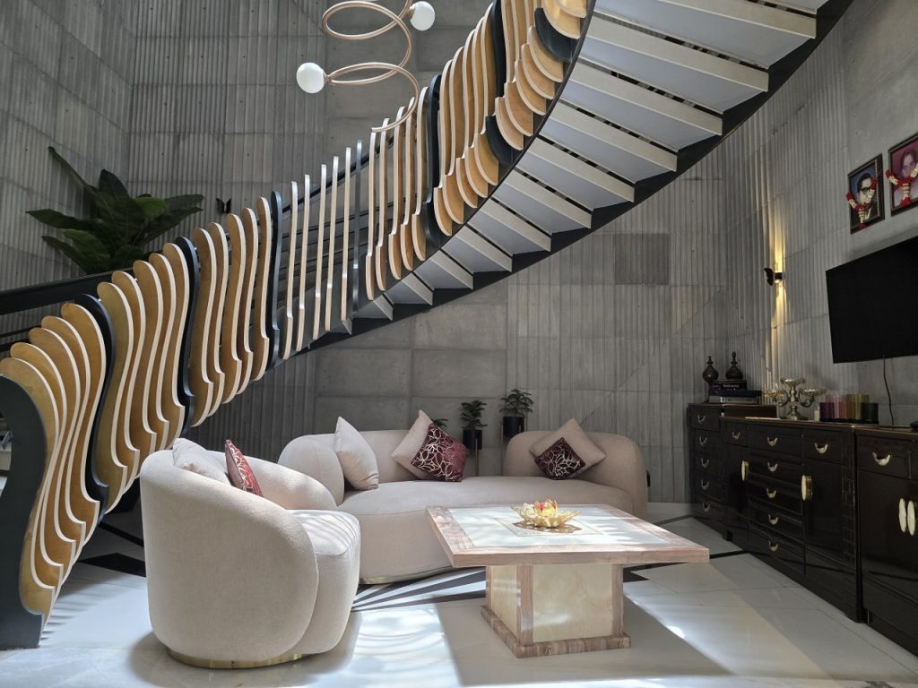 The staircase at M-Townhouse emerges not as a structural necessity, but as an architectural spectacle – a suspended sculpture that threads the home vertically with grace and precision. Rising through its own triple-height void, the cantilevered spiral form achieves both visual lightness and spatial drama.