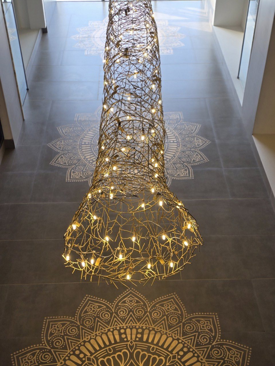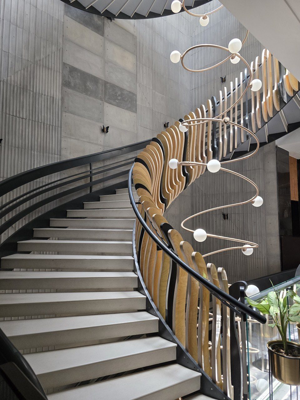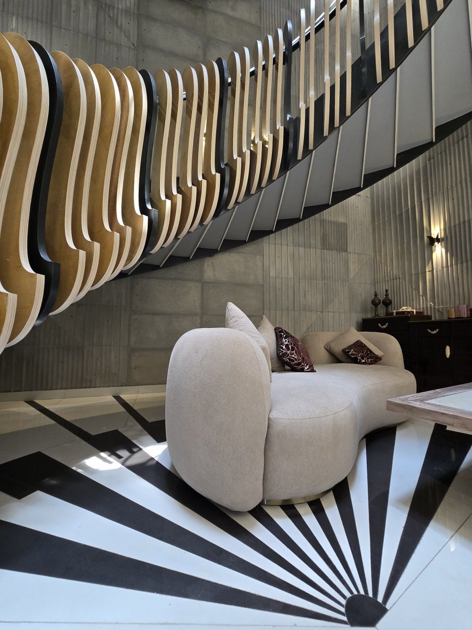 Crafted with dual identities, it features a fluid, parametric wooden handrail on one flank – soft, tactile, and integrated with hidden lighting and a contrasting CNC-cut mild steel balustrade on the other, offering a crisp, contemporary counterpoint.