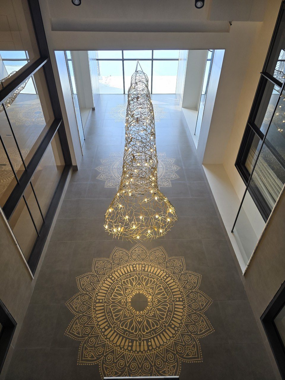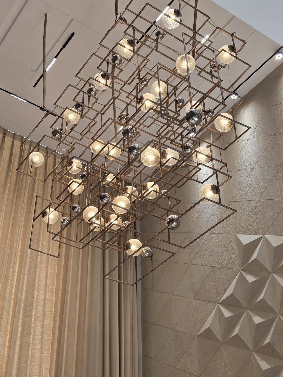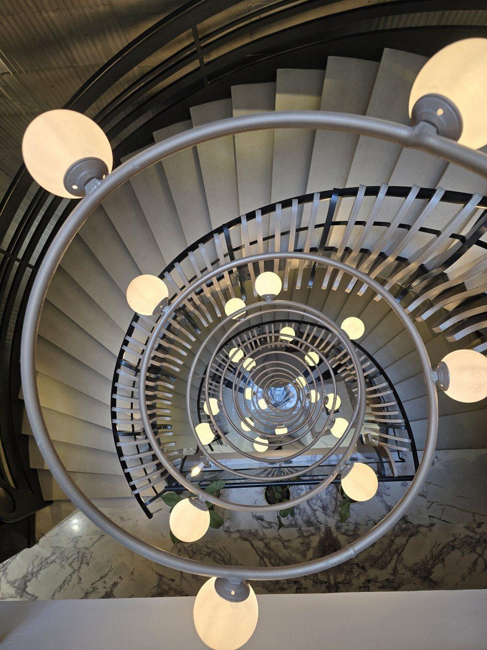 Above, a custom-designed spiral chandelier traces the geometry of the stair, culminating at a skylight that orchestrates a cascade of daylight. Framed by bespoke concrete wall panels, this vertical volume becomes a study in material harmony, spatial continuity, and artisanal detail.