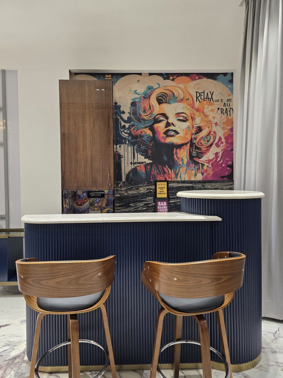 Situated between the kitchen and the sacred volume of the Pooja room, the Dining Area operates as the social fulcrum of the home. It is a place where nourishment, conversation, and ritual coalesce. Rejecting enclosure and instead embracing spatial permeability. It uses slender glass and aluminium partitions that define the space while preserving visual continuity.