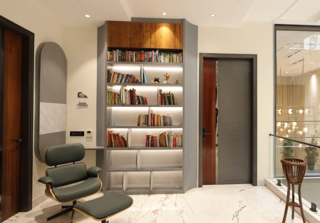 The Pooja room occupies the emotional and spatial nucleus of the residence, rising as a triple-height sanctum that consecrates stillness and light. Crowned by a skylight that modulates daylight across the day, the space is imbued with a contemplative, almost celestial aura. It is not merely a room, but a volumetric expression of reverence – quiet, grounded, and ethereal. Located between the living and dining zones, it serves as both an axis and anchor, bridging the secular with the sacred. Transparent partitions preserve the sanctity of the space while allowing light to wash gently across its periphery. The central void then serves as a vessel of luminosity, silence, and spiritual pause — a space where scale is wielded not for grandeur, but for grace.