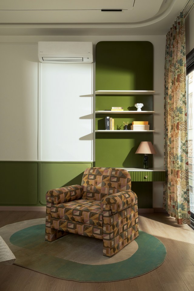 Curved ivory-beige sofas echo comfort and calm; light wooden paneling and gentle wallpaper add depth without overwhelming. The visual language is poetic, never excessive. It is a design that breathes alongside its inhabitants—a background to their everyday moments, yet a character in its own right.