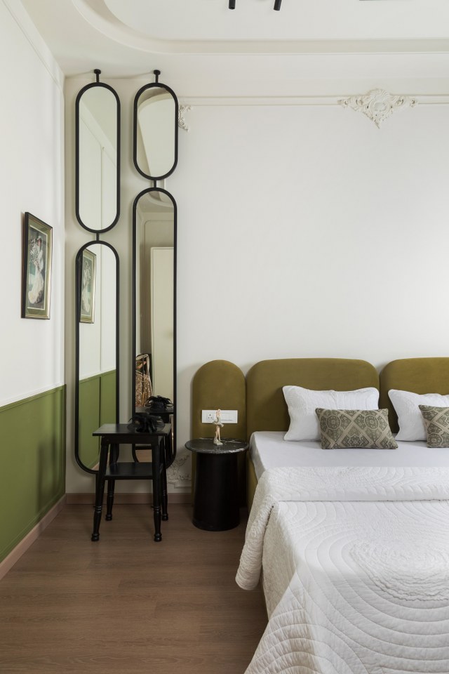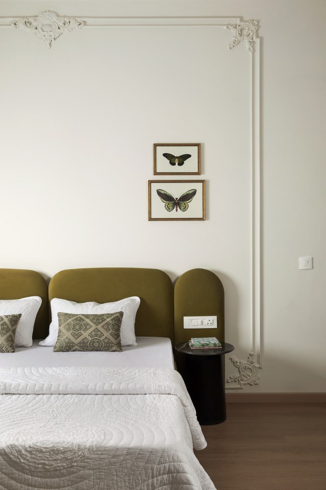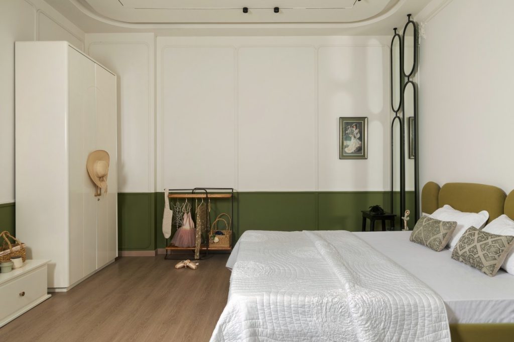 The design embraces a restrained, modern French sensibility—fluid curves, botanical motifs, pale tones, and soft paneling—woven together with natural materials and filtered light. There is a sense of balance, where the decor doesn’t dominate but rather coexists harmoniously with everyday life.