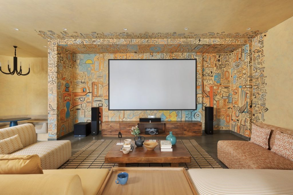 Perched atop a serene terrace, this home theater lounge is a tranquil retreat that whisks you away to the land of the pharaohs. Araish paints dress the walls in hues of golden yellow, azure blue, and desert sand, evoking the majestic palette of ancient Egypt. Intricate wall art inspired by Egyptian hieroglyphics adds an air of mystique, transporting you to a world of mystery and wonder.