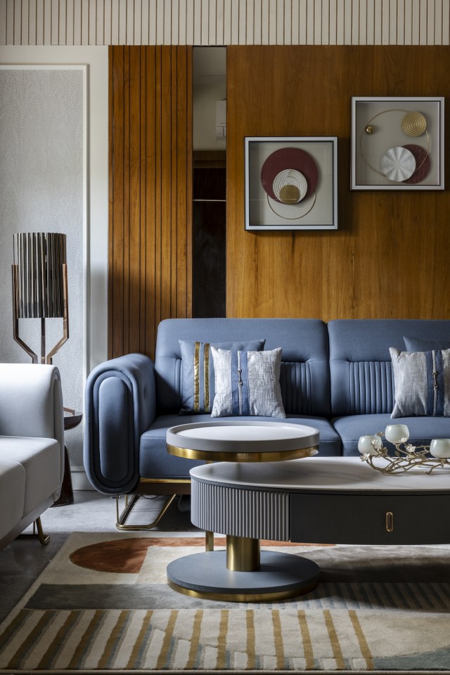 In a joint family, designing for unity without compromising individuality can be challenging. The design team skillfully addressed this by creating shared spaces that bring people together while maintaining distinct zones for personal expression. The living and dining areas, for instance, are open yet layered—inviting communal interaction but allowing for cozy, private corners. The living room, with its modern furniture and statement art, becomes a hub of energy, while the adjoining dining space glows under a sculptural chandelier that transforms everyday meals into experiences.