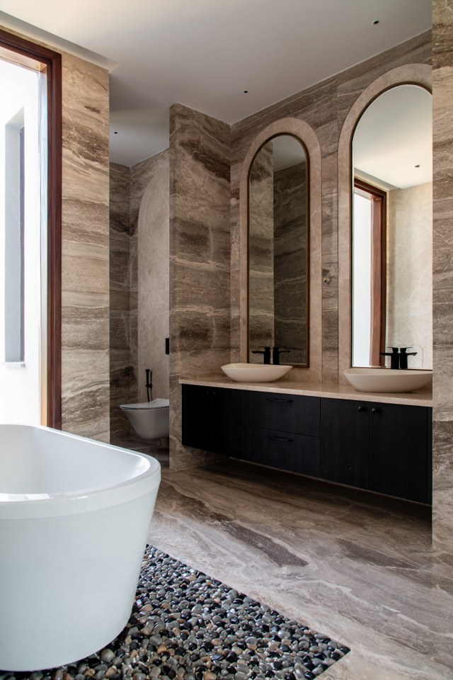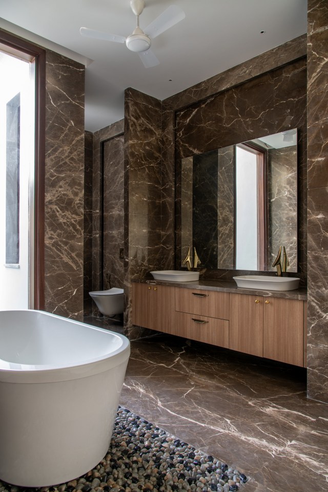 Alongside the main building, the outhouse is also designed as an extension of elegance and restraint. The interiors are entirely clad in rich marble, creating a sense of refined continuity. A minimalistic ceiling enhances the clean language of the space.