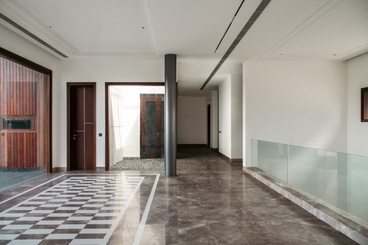 A courtyard sits at the heart of the residence, enhancing the sense of openness and scale. The design language of a monochromatic palette embraces a refined palette of monochrome tones, lending the space a timeless character while maintaining cohesion throughout the interiors.