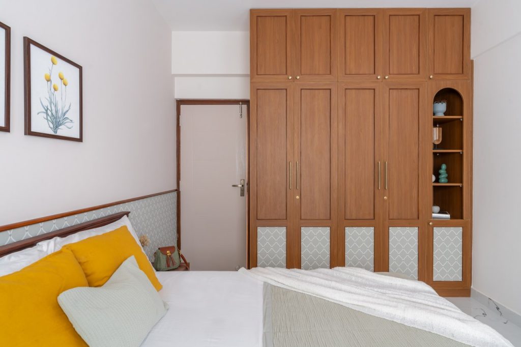Above, a loft with wooden knobs provides extra storage. Adjacent to the wardrobe, a dresser combines practical storage with open shelves. Moreover, a mirror framed in teak wood beading with a gentle curve echoes the design of the wall niches, bringing a harmonious flow to the room.