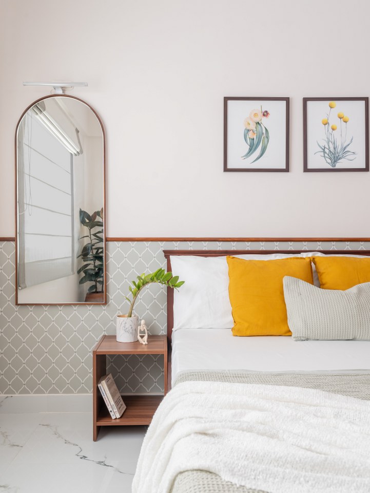 The parents’ bedroom exudes serenity and calm. The bed wall features teak wood beading, elegantly dividing the space. The lower half showcases sage green wallpaper, while the upper half is finished with soft, coordinating paint. A curved mirror hangs thoughtfully above a movable side table from Ikea, adding both style and function.