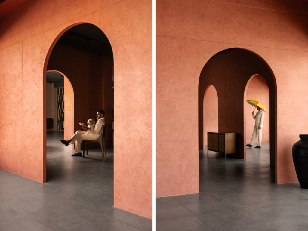 To complement this understated material palette, we introduced three bold terracotta arches that punctuate the space with sculptural intent. Beyond their aesthetic presence, these arches serve to balance the irregular shape of the store, bringing a sense of symmetry while adding visual interest. Their curved forms soften the structured geometry of the space, creating a rhythm that guides movement while enhancing the store’s architectural identity.
