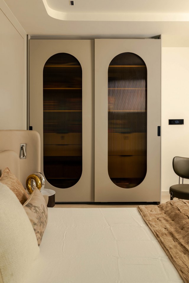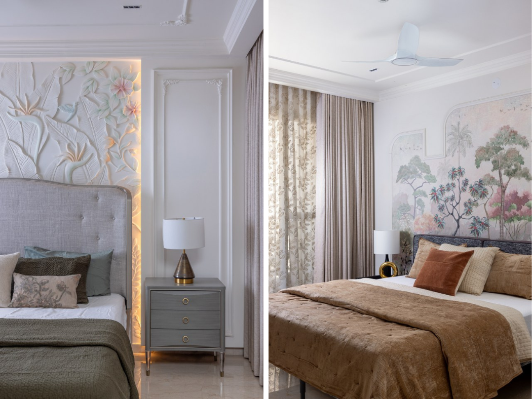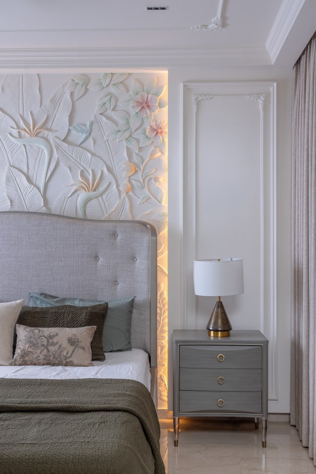 This Master Bedroom is a serene escape, harmonizing classic architectural details with modern artistry. The centerpiece is the custom-made headboard wall, featuring an exquisite backlit bas-relief carving of tropical flora and fauna by Reverie Murals, instantly establishing a tranquil atmosphere.