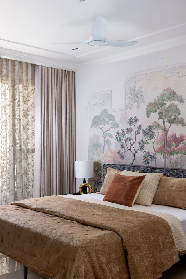 The Guest Bedroom offers a serene and whimsical retreat centered around a wallpaper featuring a charming, soft-hued wallpaper of an imagined forest landscape from Kalakaari Haath.  The color palette incorporates earthy tones, from the rich rust and tan pillows to the plush, warm-brown duvet. Elegant ceiling and wall moldings provide a classic contrast to the modern, art-forward mural, resulting in a comforting and visually delightful space that welcomes visitors.