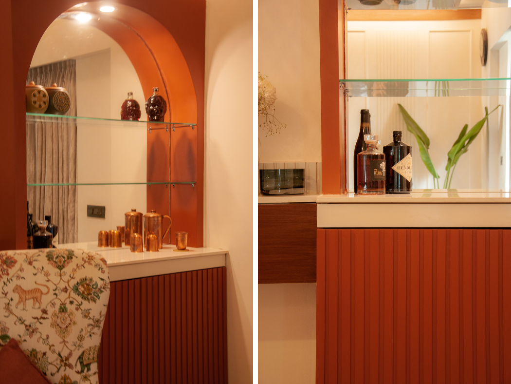 Complementing from across the corner was the mandir. Delicate bells adorn its entry, and the team decorates the bright orange walls with the beautiful cows of Pichwai art, visually expressing the couple’s spiritual and artistic journey. Colors and materials have appeared in small, deliberate bursts with a golden vintage mirror between green colored consoles of distressed wood, the rust-toned bar backed by reflective glass, floral upholstery, Wallpaper & traditional art, fluted glass shutters; but made clear by this little list, there was no overarching theme. As Saumyaa, the principal architect, reflected, “We didn’t chase perfection. We followed the people”