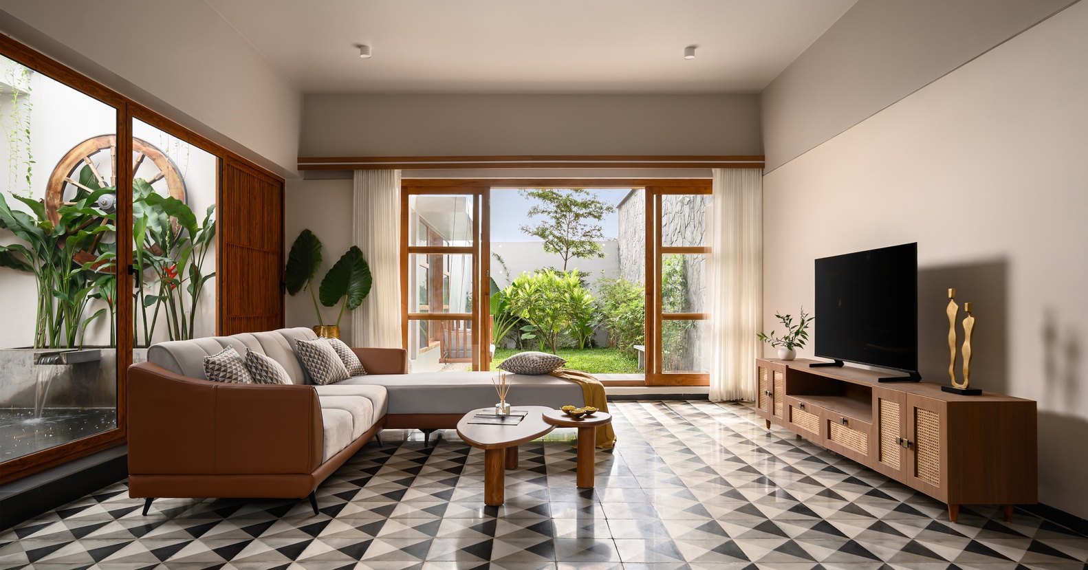 Craft and tradition enrich the contemporary spatial character. Floors patterned with Athangudi tiles bring vibrancy underfoot, their intricate Quiet Retreat motifs echoing the cultural lineage of South India. A winding spiral staircase introduces a sculptural moment within the home, an upward journey culminating in a timber-lined attic, where the material warmth transforms the atmosphere into one of quiet retreat.