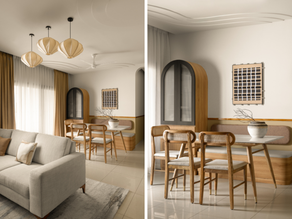 The dining space is designed as an intimate corner that blends warmth with structure. A custom curved crockery unit in natural veneer softens the linearity of the layout, becoming a quiet sculptural element in the room. The fluted glass shutters lend lightness and visual layering while subtly concealing storage. The built-in bench with rounded edges continues this sense of softness, detailed with upholstered backrests in muted beige. Paired with cane-back chairs and a slim dining table in white marble-finish top, the space maintains a grounded material palette inspired by creme brulee — oak tones, tactile fabrics, and warm neutrals To create a calm, lived-in ambience that flows seamlessly from the living area.