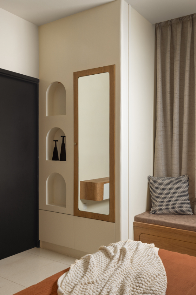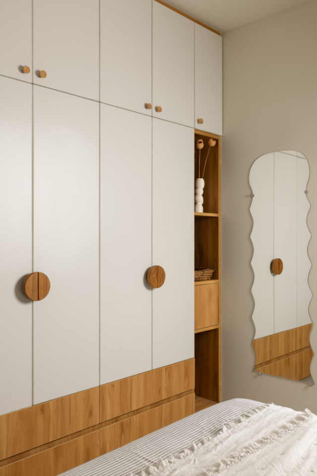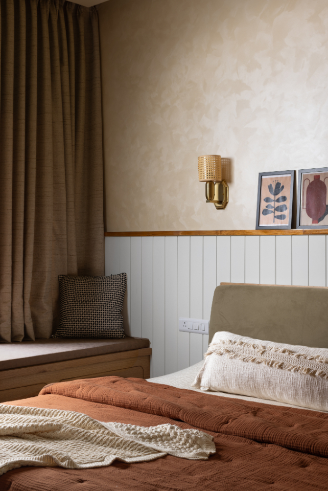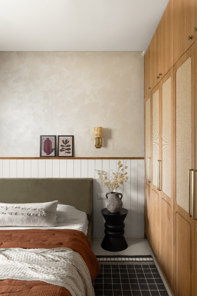 Design Language: Lime-washed walls diffuse light softly, while vertical panelling adds rhythm. Oak veneer wardrobes with woven cane insets and brass handles bring warmth and quiet detail. A built-in window seat extends functionality without cluttering the layout.