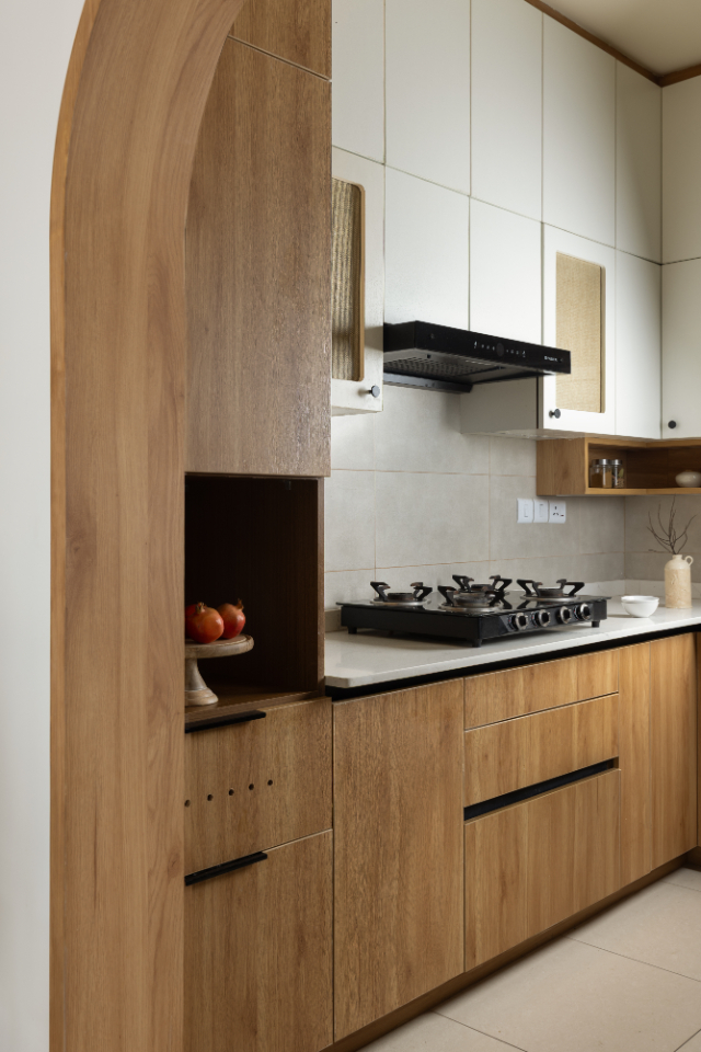 The kitchen continues the home’s calm, earthy palette, a mix of oak-finished lower cabinets and white shutters above, detailed with rattan inserts for texture and warmth. The arched opening frames the space softly, creating a visual link to the dining area. A quartz countertop and neutral backsplash keep the look clean and light, while concealed lighting adds depth without breaking the simplicity. Every element is functional, tactile, and warm, designed to feel lived-in, not styled.
