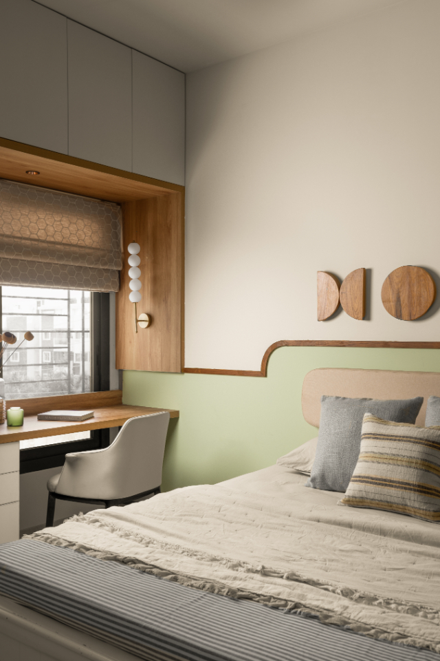 Design Language: Mint-green wainscoting introduces freshness against warm oak detailing. Circular motifs and curved trims lend a sense of ease and continuity, echoed in the mirror and wall art. The study nook by the window is framed in wood, adding structure and warmth.