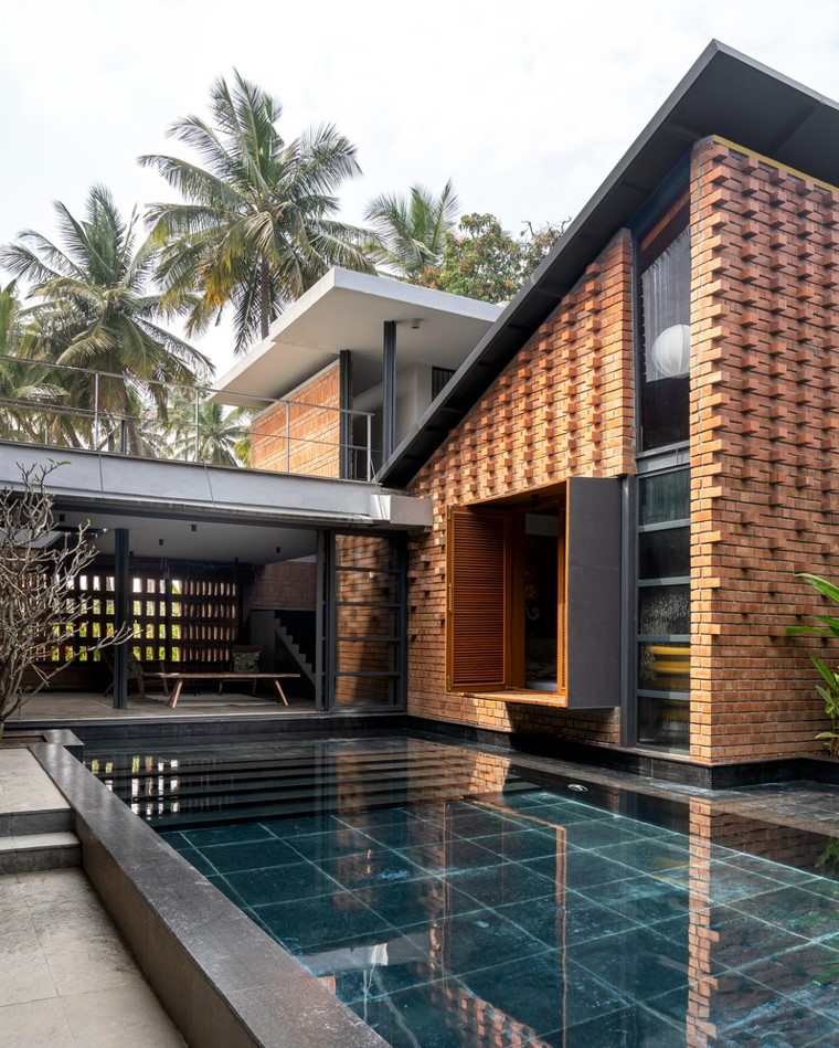 It has stone paving, brick walls, a sloping roof, and a courtyard connecting all the spaces. The courtyard has spaces such as a water body that uplifts the quality of space while transitioning. The surroundings have long trees in front of the water body surrounding the spaces of the house. Moreover, this environment and the presence of the courtyard connecting the house make it feel like a Kerala-style home.