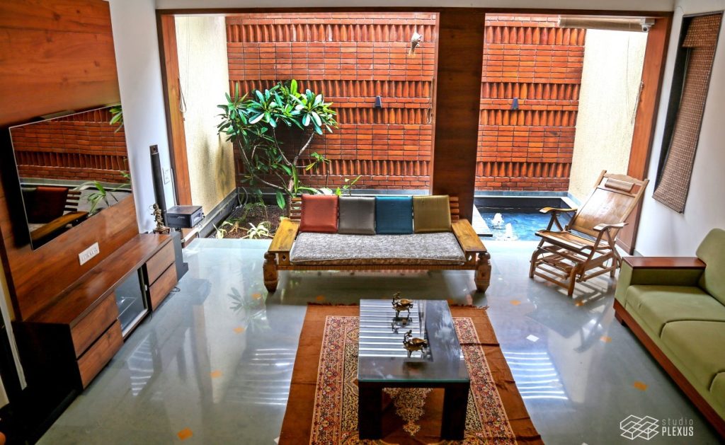 The courtyard separates the living room and other spaces, while giving a beautiful transition space within. As a result, it maintains privacy by keeping the openness intact. The presence of the courtyard inside the house gives the effect of Kerala-style homes to those staying in it. The ground floor is organizes itself around the courtyard, which is the interpretation of the traditional houses.