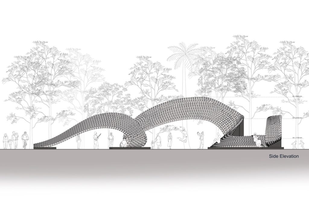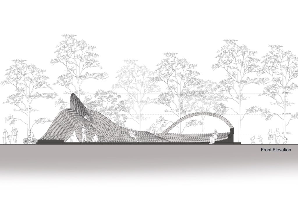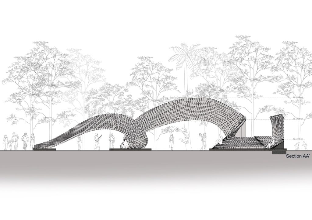 Consisting mainly of 3 compressive catenary vaults that transfer the weight of the entire superstructure to the ground, the pavilion was designed as a series of unreinforced vaults that meander across the side of the beach between the trees as seatings and stages, aiming to provide shade to both humans and animals alike.