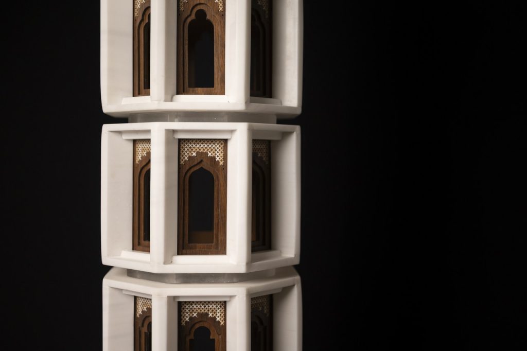 Mīnāra is a primarily handmade, floor-standing lamp. The cool, timeless elegance of marble lends structural stability and sophistication, while the warm, organic tones of teak add depth and natural texture. Delicate threadwork weaves across the piece, offering visual intricacy and tactile warmth. Blending ancient craftsmanship with modern innovation, Mīnāra symbolizes the harmony between heritage and contemporary design. It merges the minimalism of stone with the expressive warmth of wood and thread, creating a textural and conceptual dialogue that appeals to both the senses.