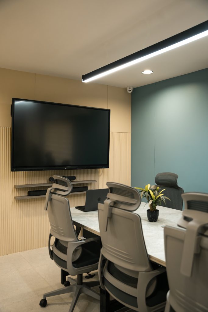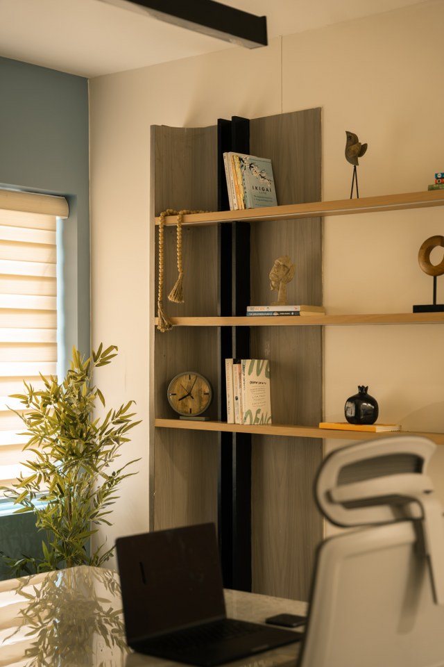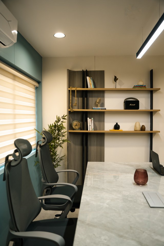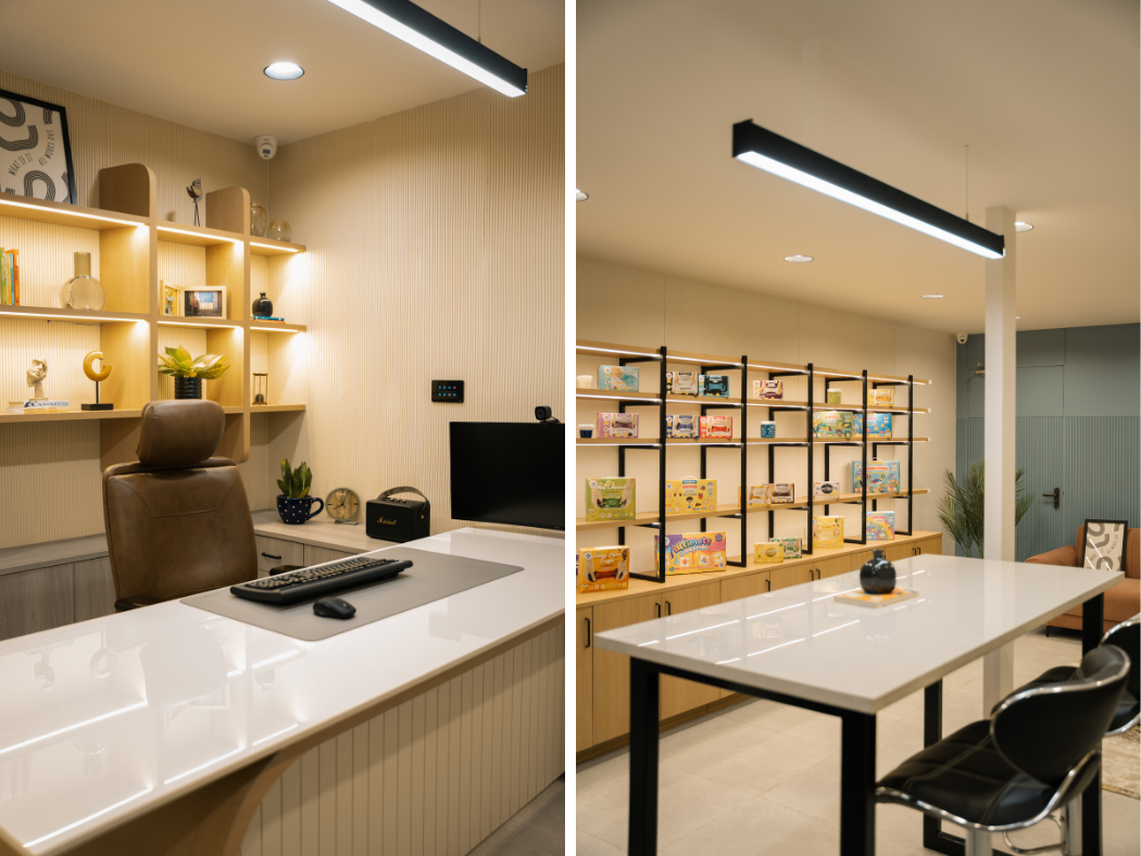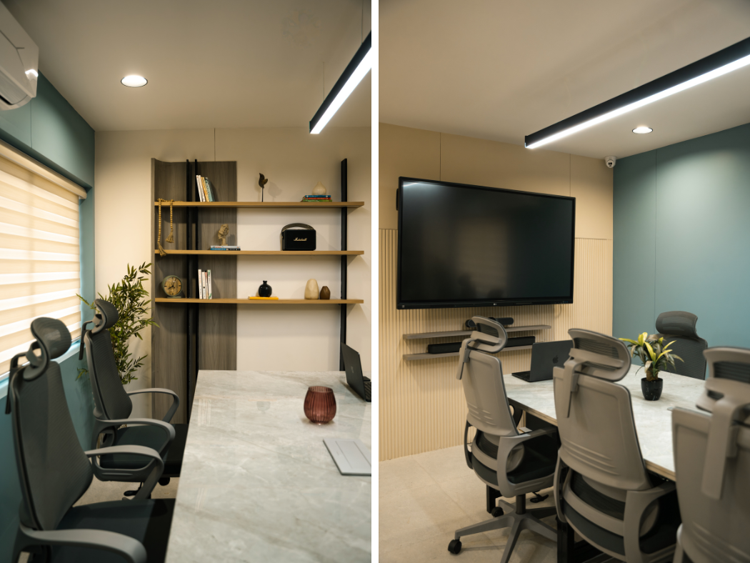 The client’s brief was to create a fresh, contemporary workplace along with a content creation studio in an 800 sqft area. The Office is envisioned as a modern workplace that radiates calm, balance, and understated elegance. The design draws inspiration from natural colors and clean lines, creating an environment where focus and comfort coexist harmoniously. Every corner of the office reflects a curated blend of functionality and design sensitivity, where materiality and mood play an equal role in shaping the user’s experience.