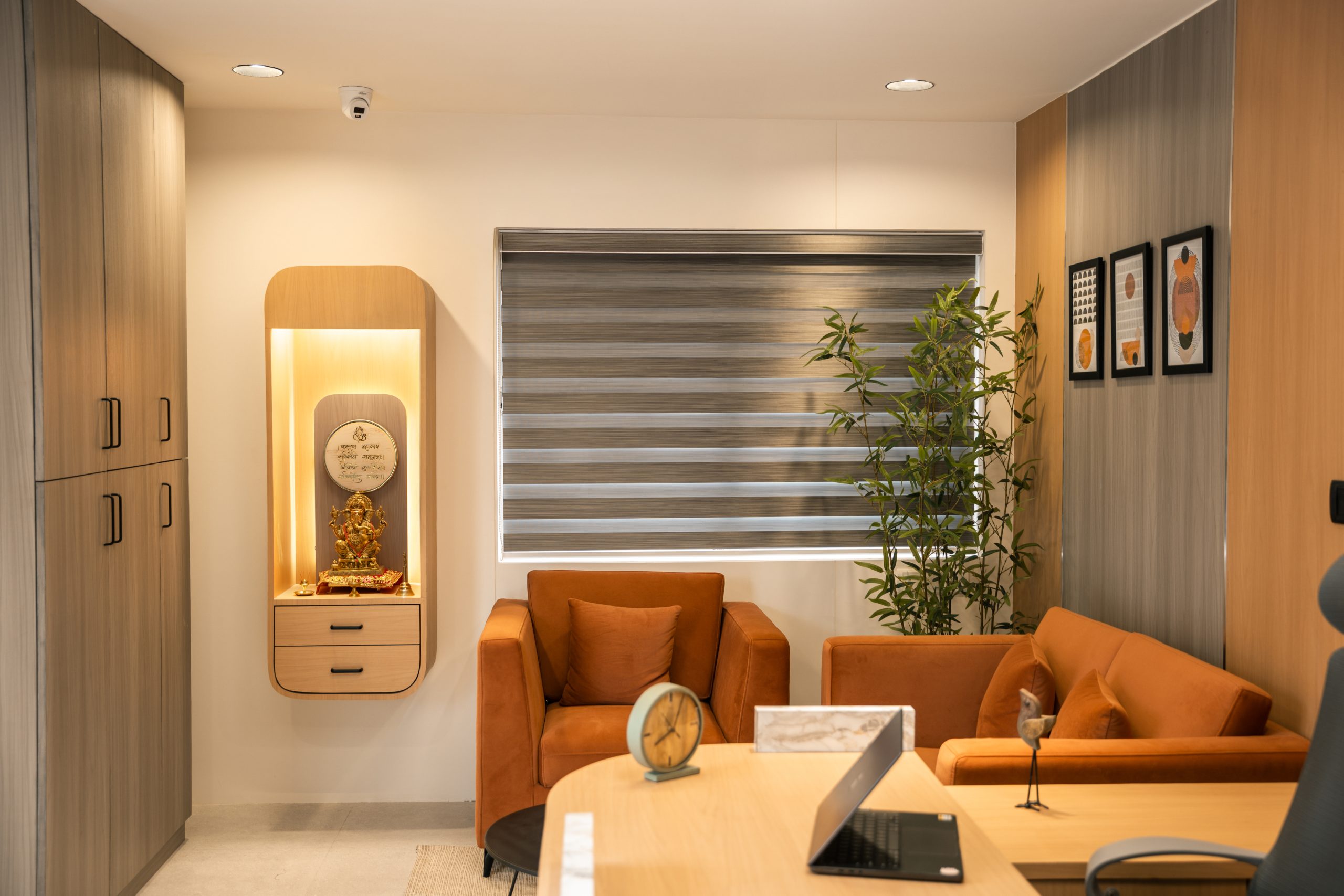 The design immediately puts visitors at ease and conveys both professionalism and warmth. The reception is not just a waiting point but an introduction to the office’s atmosphere — calm, creative, and grounded. The client subdivided the reception area into a waiting area and a small designated mandir in the northeast corner of the office space to reflect their strong belief in God.