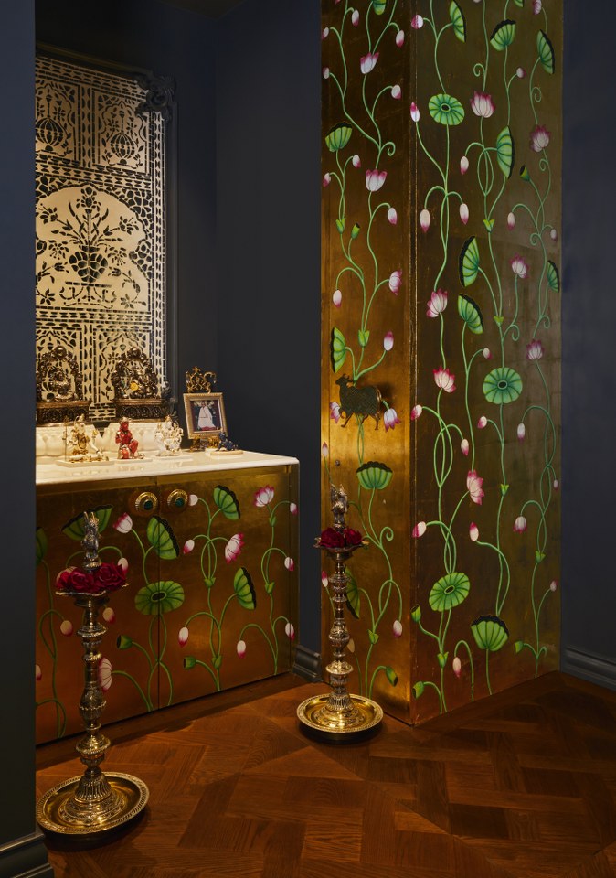 The mandir area, handcrafted in thikri and pichwai by artisans from Udaipur and Jaipur, brings a sacred stillness. It is a reminder that craftsmanship is as spiritual as it is aesthetic.
