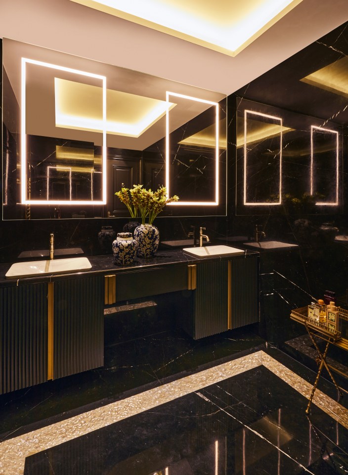 The ensuite bath, finished in Belgium charcoal marble with mother of pearl detailing and wardrobes by Alsorg, reflect refined craftsmanship and elegant asymmetry.