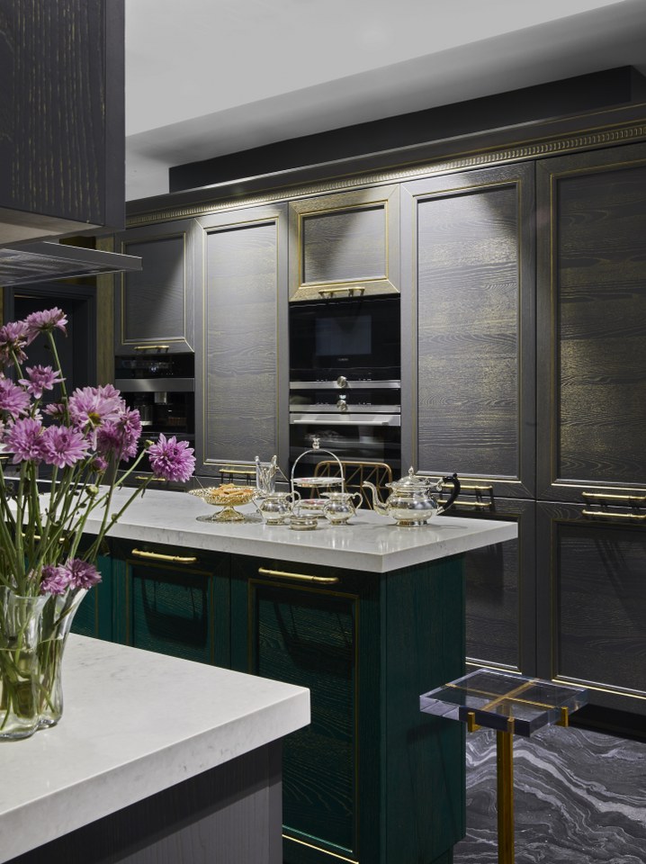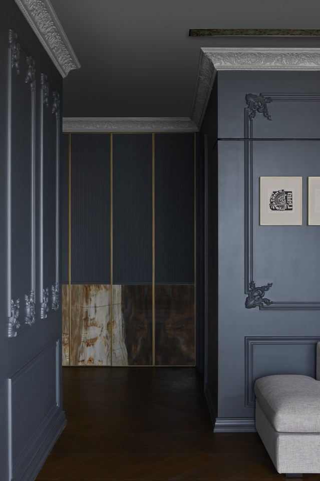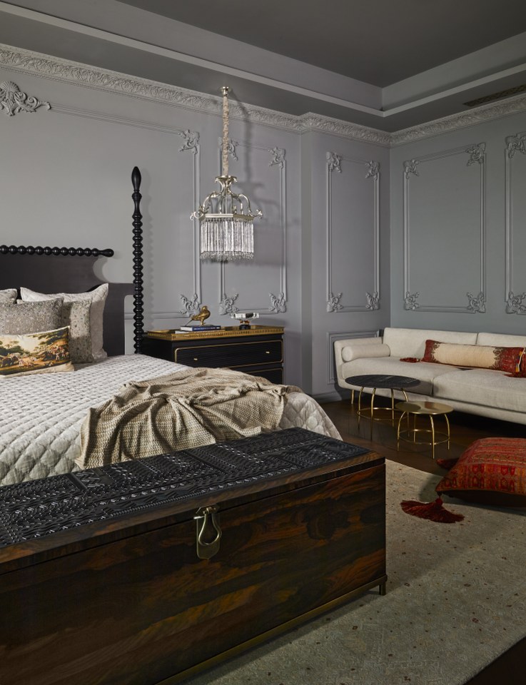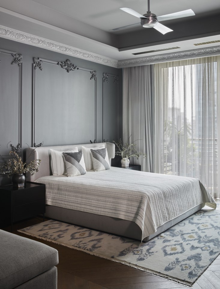 Perched on the twelfth floor of a Gurgaon high rise, the apartment reimagines splendour for modern living. The homeowners, once residents of a sprawling bungalow, longed for a space that echoed their former home’s opulence while embracing the efficiencies of apartment life. The result is an aesthetic dialogue between eras. A neoclassical contemporary symphony wrapped in charcoal. Extensive mouldings frame the walls like artworks on them, while muted light and rich textures lend the interiors an air of cinematic intimacy.