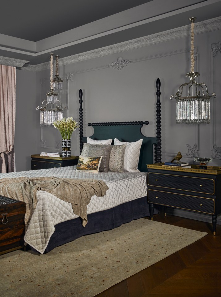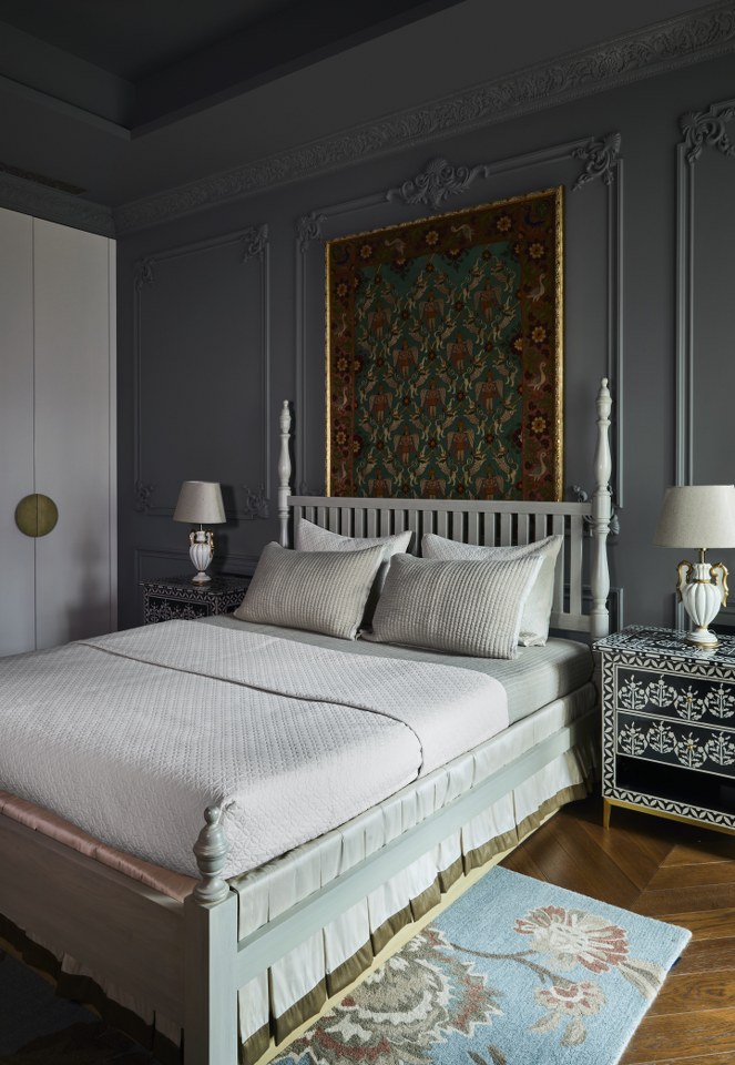 The master bedroom features bespoke furniture from Beyond Designs complimented by an Obeetee rug paired with handcrafted wooden accents.