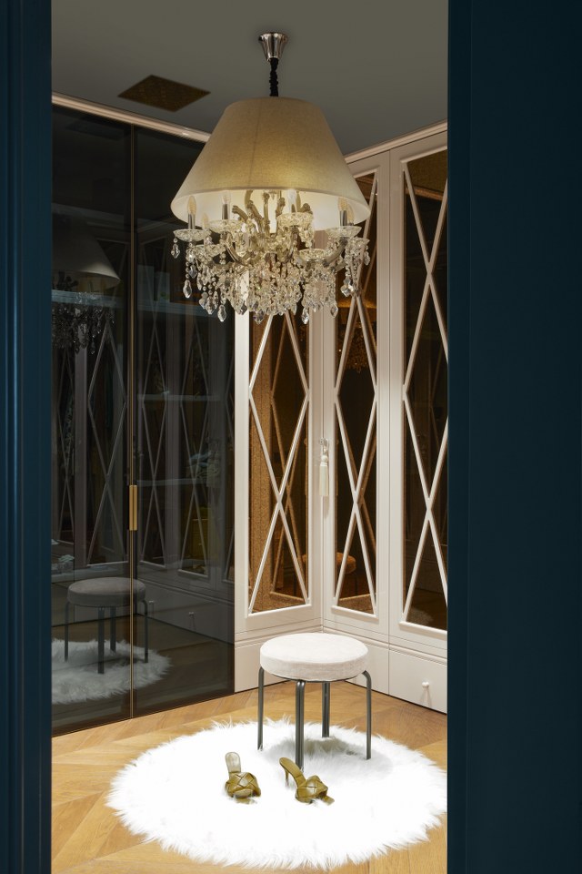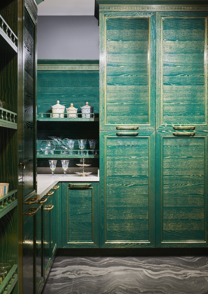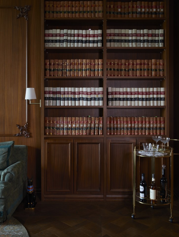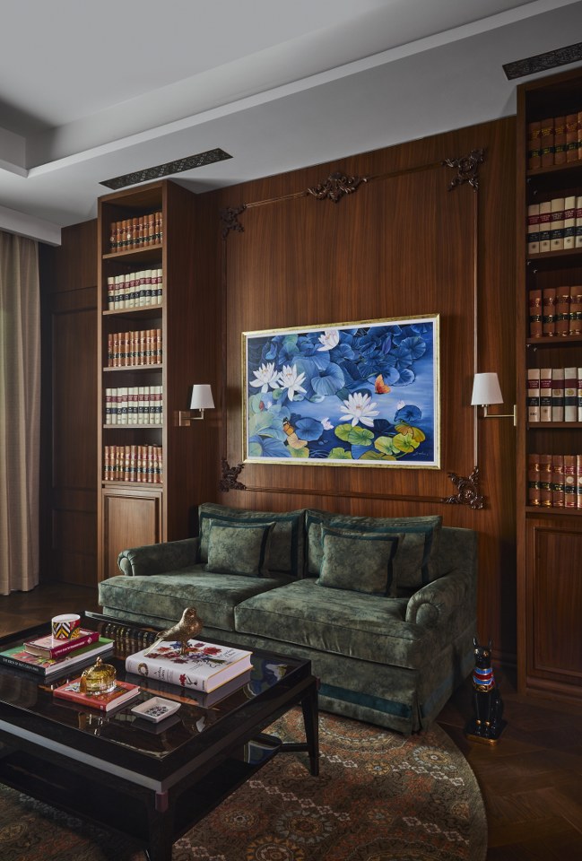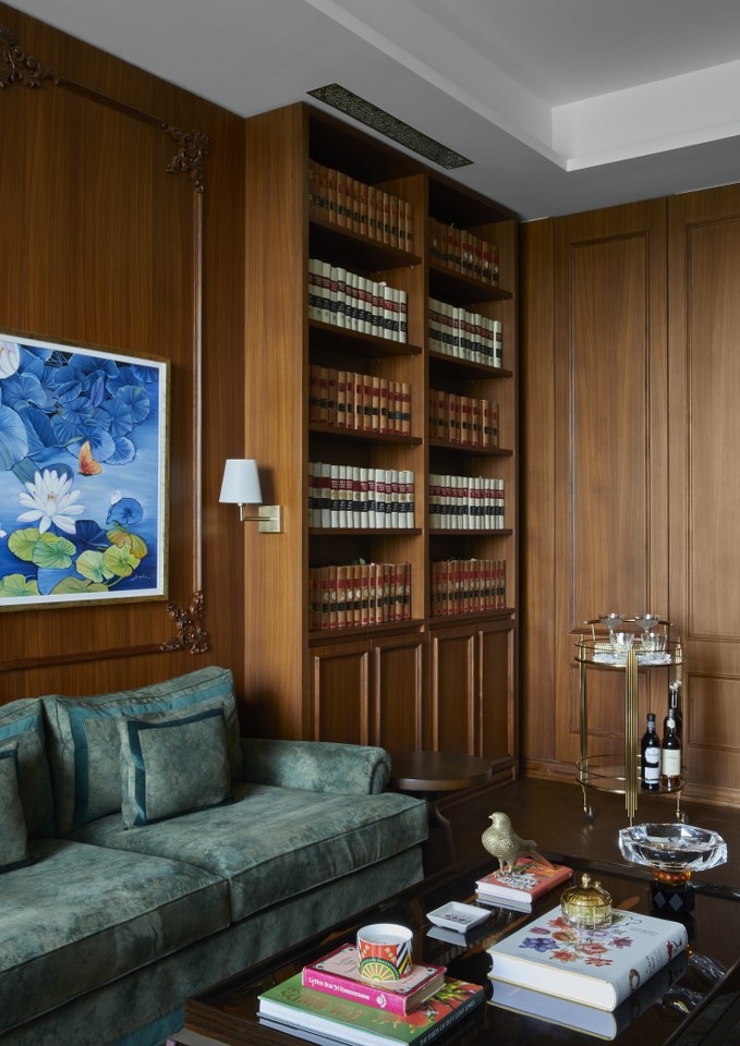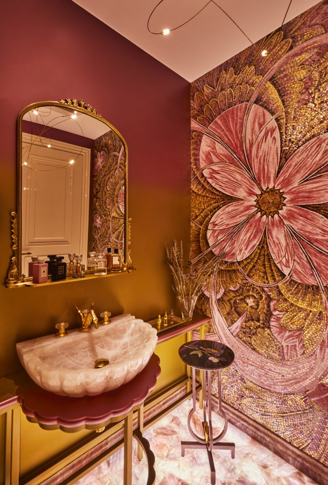 “I wanted to create a neoclassical atmosphere and an ambience, not just a space,” says Disha. And atmosphere she does. The lift lobby itself hints at the spectacle within chandeliers from Sicily, mirrored frames recalling European ballrooms and the delicate ‘Meadow Table’ by Rooshad Shroff that anchors the entrance with real pressed and lacquered flowers gathered from London and Mumbai. Inside, every detail feels deliberate: bespoke mouldings, custom made light fixtures, hand carved fireplaces, painstaking mosaic inlay in wooded floors reflects months of meticulous craftsmanship.
