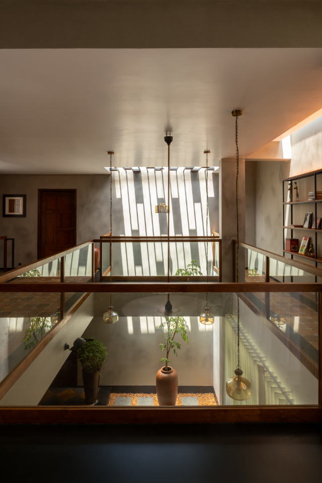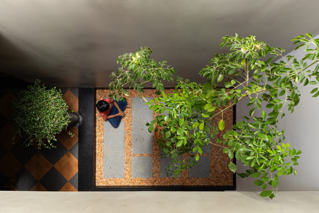Adjacent lies a compact courtyard: an open-to-sky retreat forming a meditative pause where a perforated jaali filters sunlight into dappled shadows across its wall while the pebbled floor creates a sensory experience.