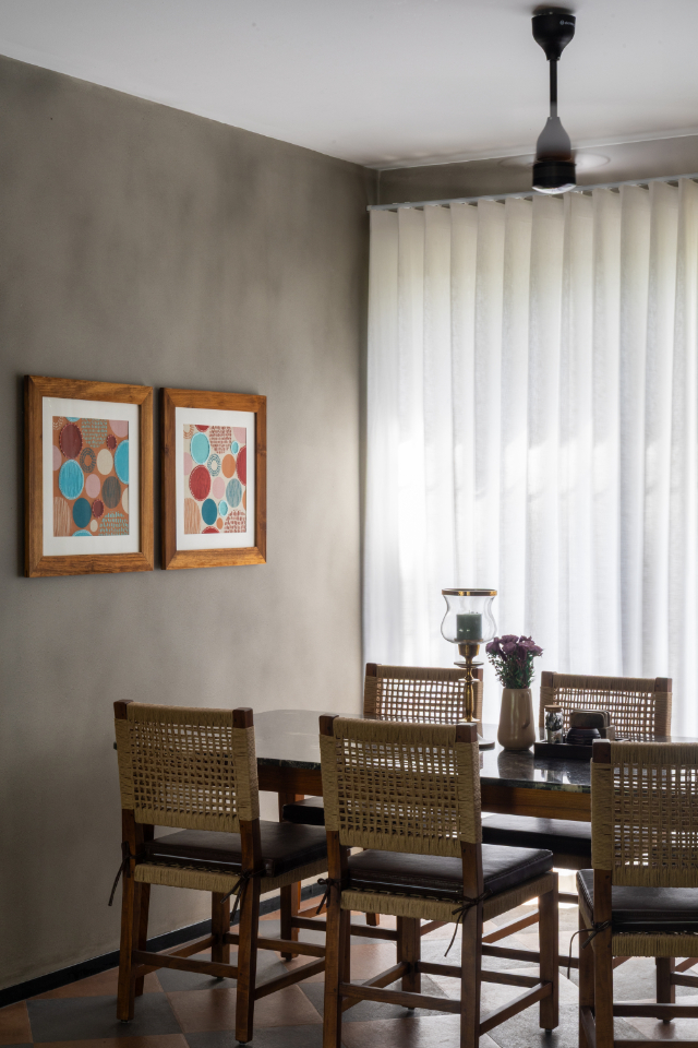 Flooring plays a central role in defining the interiors. A diagonal chessboard-like arrangement of earthen and charcoal-grey tiles lends rhythm to common zones, flowing into the dining area where rattan chairs encircle a simple table against a muted grey backdrop.