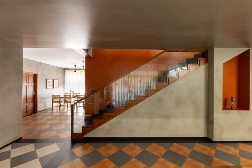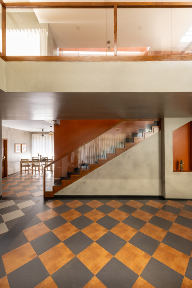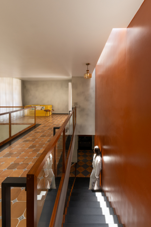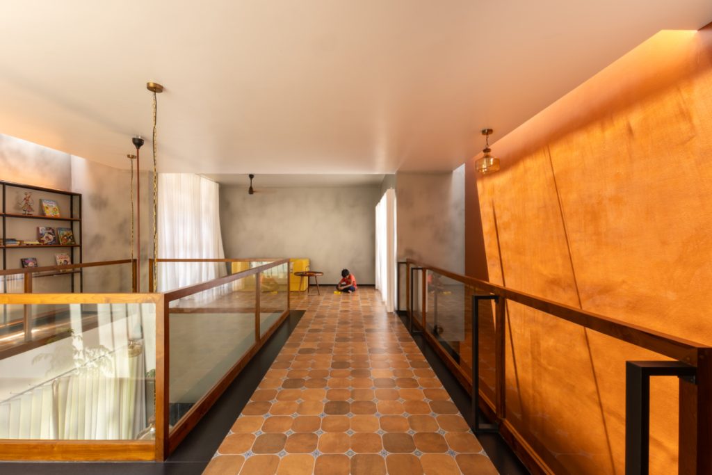 Above, the upper floor shifts into a gentler palette. The flooring becomes finer, with softer motifs, marking the transition from communal liveliness to private retreat. A slim bridge connects the two wings, overlooking the living and courtyard volumes while leading to a wall of open shelving that holds the family’s keepsakes.