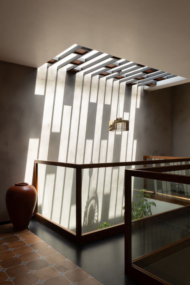 The design remains deeply responsive to environment and lifestyle. Cross-ventilation, large openings, and skylights choreograph an ever-changing play of light and shadow. The recurring brick-toned accent walls punctuate the muted grey interiors, ensuring vibrancy without excess.