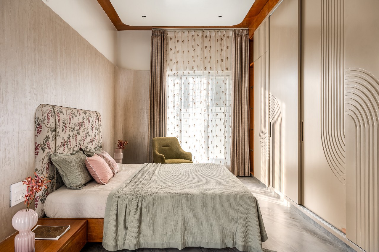 On the same floor, a cosy bedroom embraces the southern sun with earthy hues reminiscent of a lingering sunset.