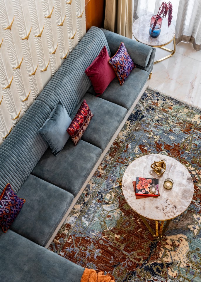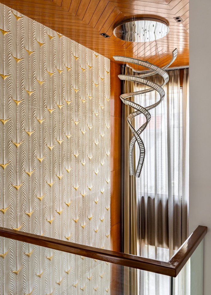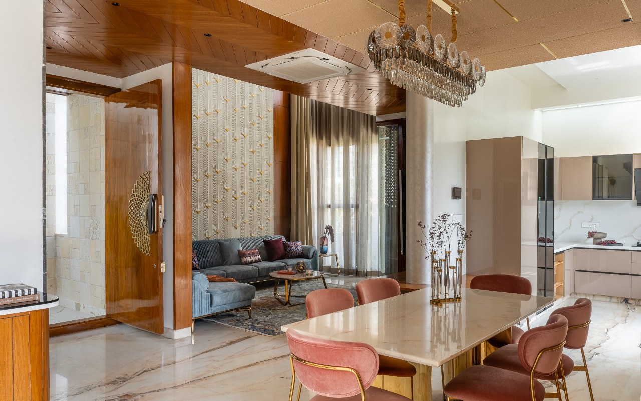 The material palette is warm and immersive. Rich wood tones, veined marbles, brushed brass, and artisanal surfaces create a multisensory experience. Key surfaces are animated by textures, stone cladding, handcrafted panels, and luxurious fabrics, each defining zones without rigid enclosures. The architecture allows materials to speak, surfaces to breathe, and light to choreograph quiet moments of beauty and openness.