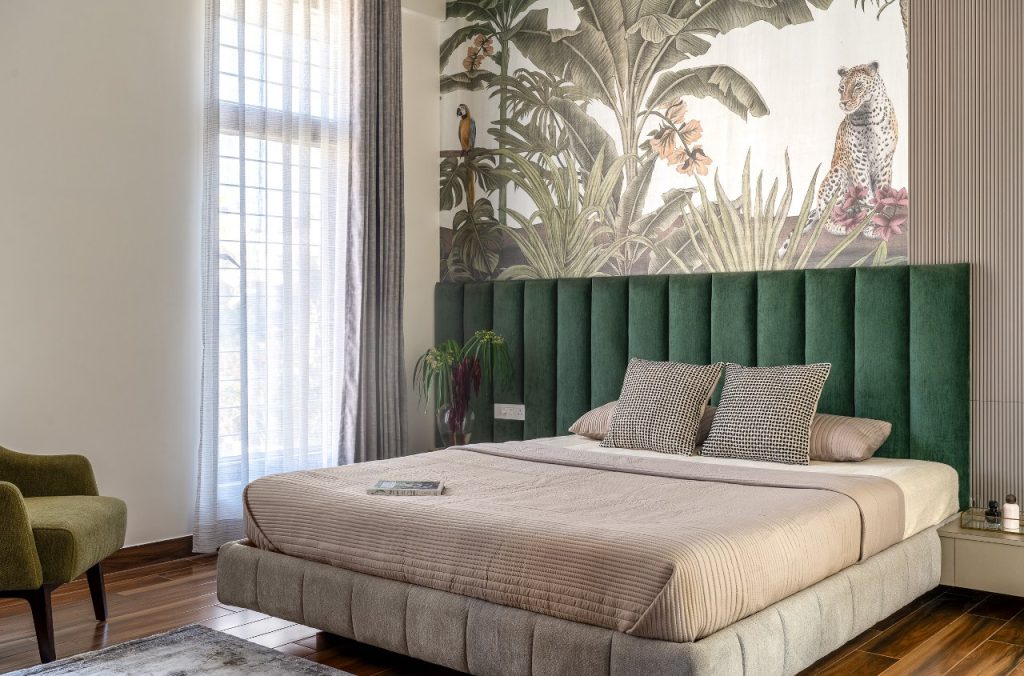 Upstairs, the second floor is home to the private quarters, maintaining the concept of openness of the house. Here, dual personalities emerge: the master suite sings in soft floral tones and pastel cabinetry, while the son’s room embraces a bold and structured identity, animated by a striking tropical wallpaper that becomes its centrepiece.