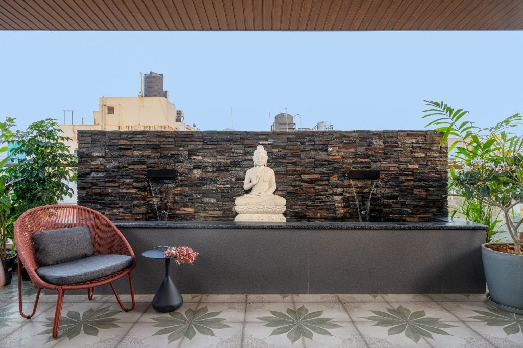 The third floor ascends into leisure, a secluded lounge crafted for repose and reflection. A custom bar unit anchors the space, which then opens onto a beautifully landscaped terrace. Koi fish circle serenely around a Buddha statue in water. The designers have nestled it among lush plantings, an urban oasis suspended above the city.