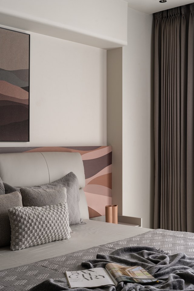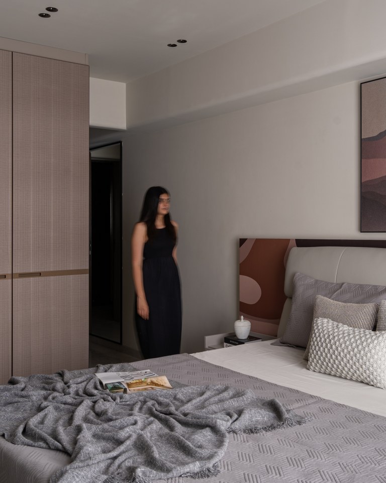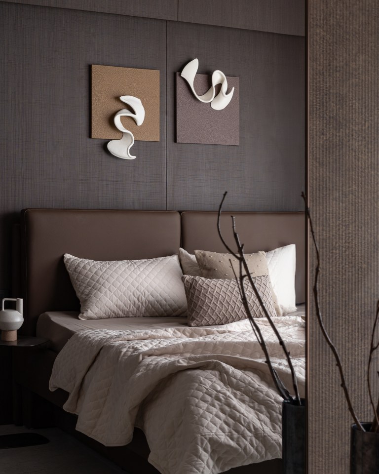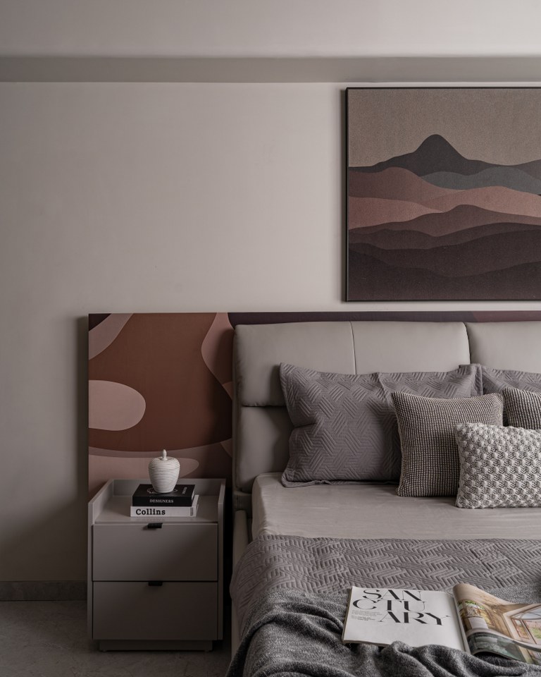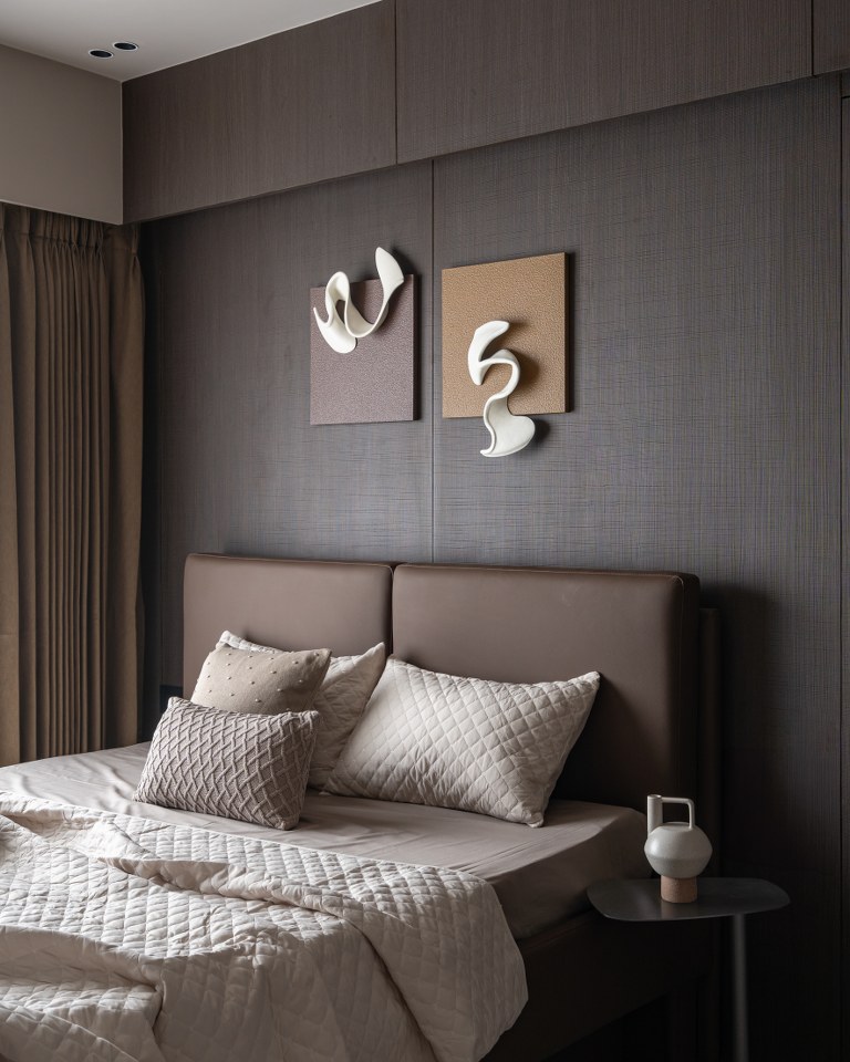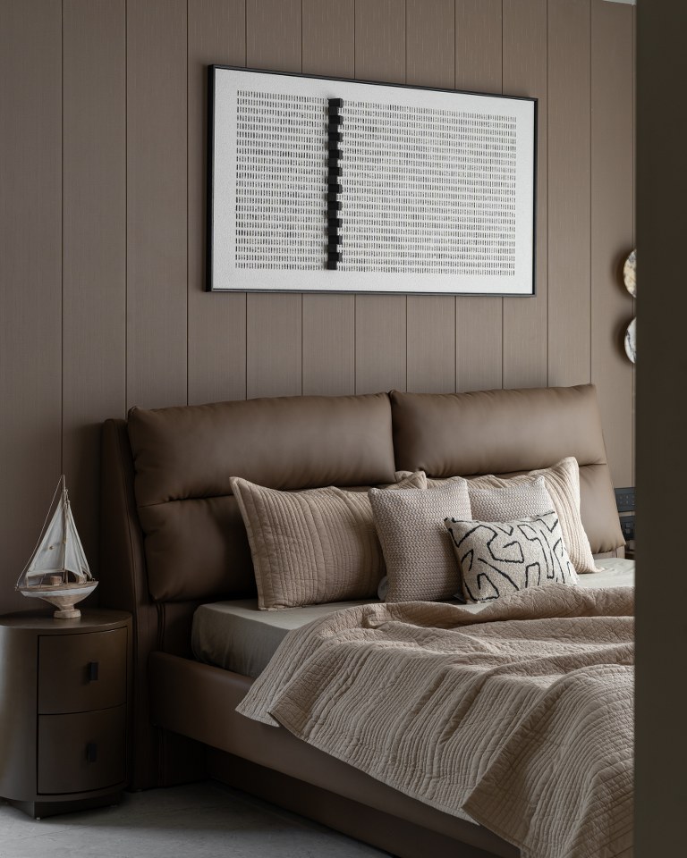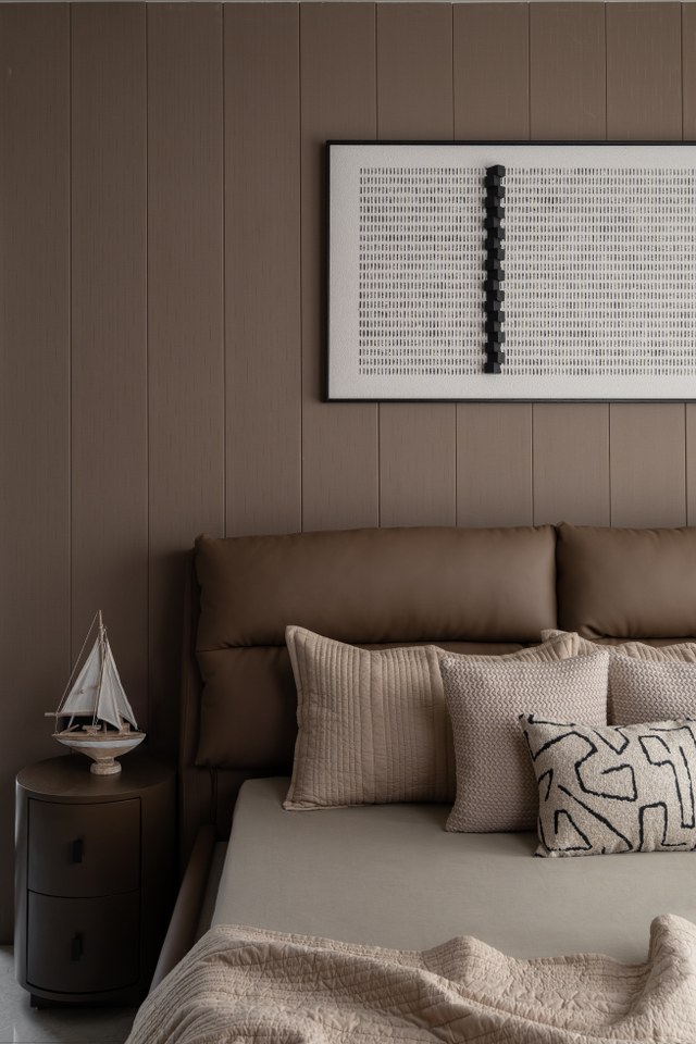 Each bedroom continues the theme of “Quiet Luxury”:● The Earth-Toned Suite: Features a custom headboard with abstract, desert-inspired graphics that complement the mountain-scape artwork above. The use of varied textile textures from quilted bedspreads to woven cushions creates a sensory-rich environment.● The Minimalist Suite: Focuses on verticality, with floor-to-ceiling ribbed panelling in a soft cocoa shade, providing a serene backdrop for sculptural 3D wall art.