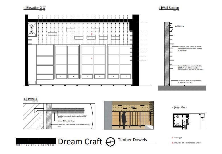 Within the space, there is a subtle shift in the materiality – the surfaces are smoother, the smoked maple ceilings and walls have been sanded down and the effort is almost to create the interior of a jewel box. Crisp black shutters define the shelves in one half of the space while the rest of the walls are dotted with smoothly machined wooden dowels. These cylindrical protrusions animate the walls with their shadows and can be moved around and reconfigured to accommodate the varied nature of the products on the walls and within the cupboards. Their varying length also helps create the impression of an imaginary curvilinear lamina, an invisible surface acting as a second layer of enclosure. The play of shadows crafts a dynamic experience along with the intensity of the light within the cupboard. A small screen is utilized to segregate the attendant from the guest.