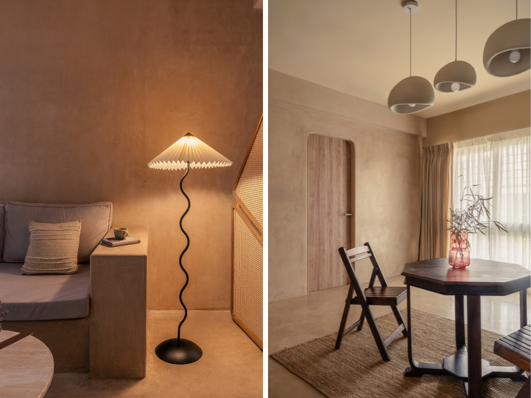 Furniture was approached as an extension of the architecture. In-built pieces, cast in-situ and finished in oxide, serve as sculptural yet functional anchors — from shelving to seating. Freestanding furniture was kept minimal and light, ensuring the clarity of the space remained intact. Among these, a custom-designed folding partition in a wooden frame with woven rattan panels plays a key role.