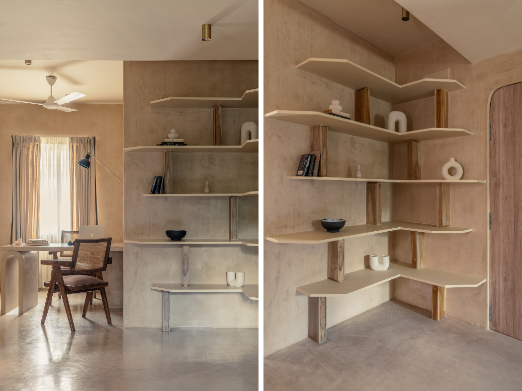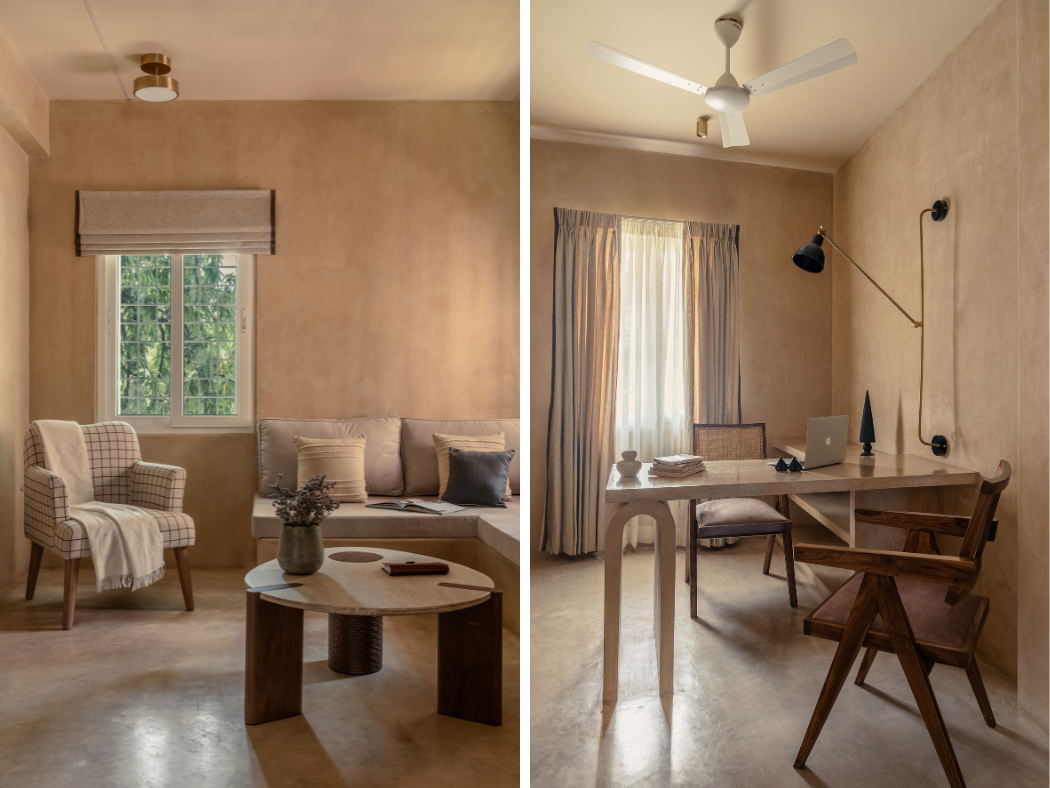 The inspiration for materiality and tonality came from the client’s recent travels. “During a visit to Egypt, the raw tactility of spaces, the earthy tones of architecture, and the way light shaped volume struck him.” Translating these impressions, the design employs oxide finishes in a warm taupe tone that wrap the floors, walls, and in-built furniture. This created a seamless, quiet space in a monolithic shell that feels timeless and grounding. Beyond aesthetics, oxide was also a pragmatic response to the site’s condition: avoiding wood joinery in a termite-prone space, while allowing surfaces to evolve with irregularity and patina over time.