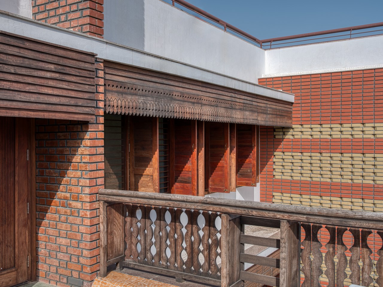 The majestic drawing room wall with full-height fluted wooden shutters shows the love for raw materials. The drawing room’s formal, minimalist furniture proclaims it as a space for receiving occasional visitors.