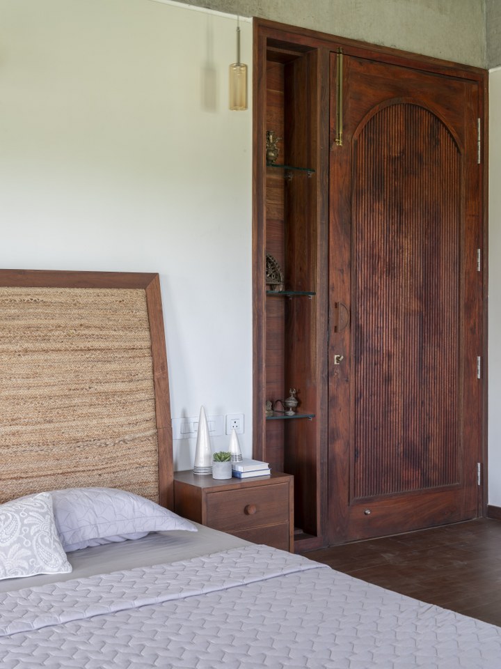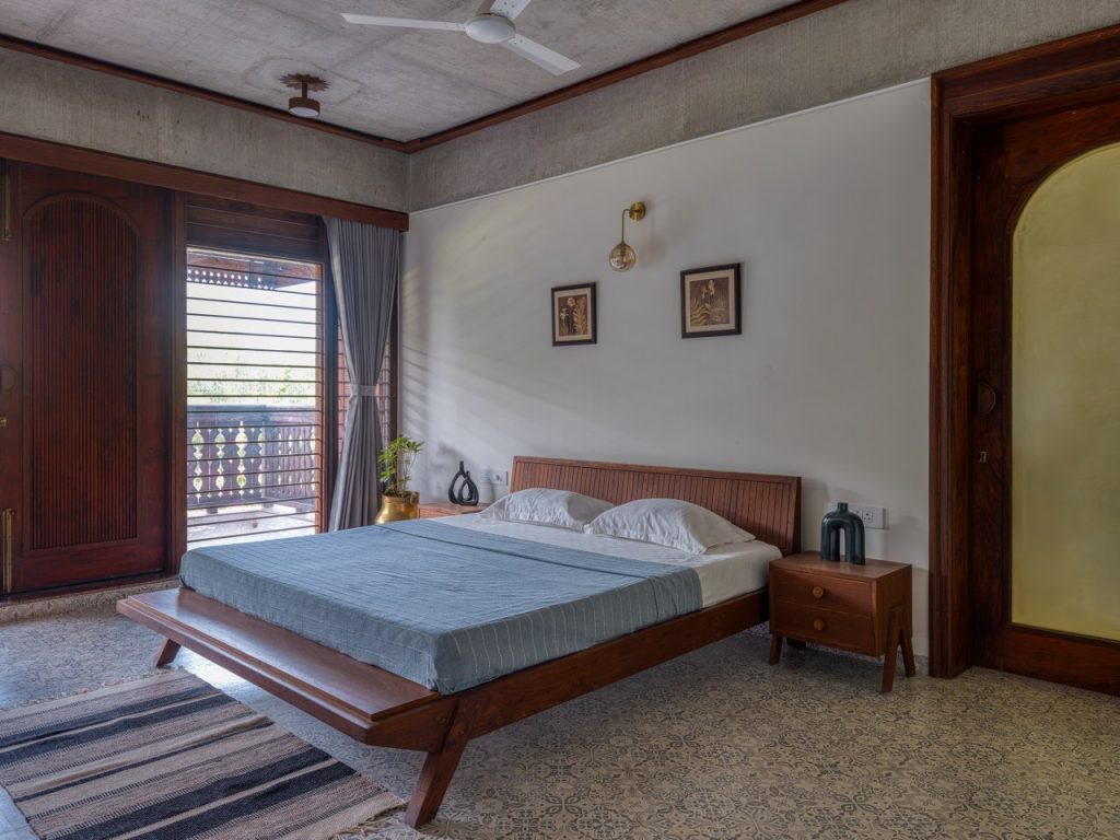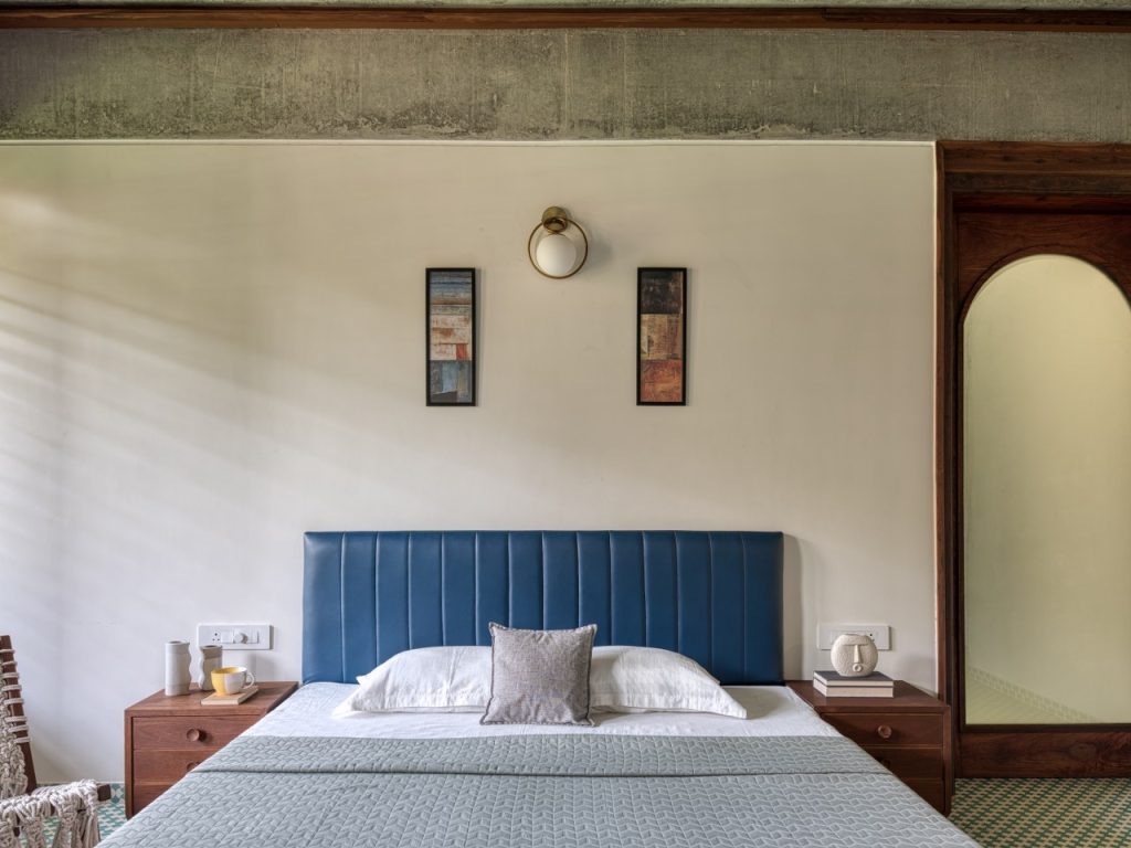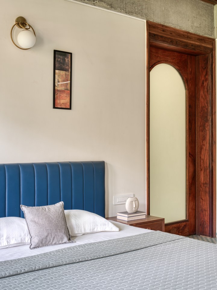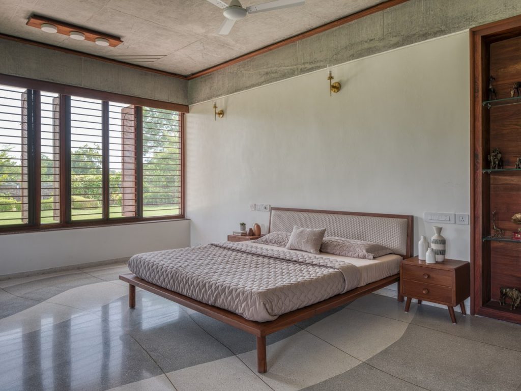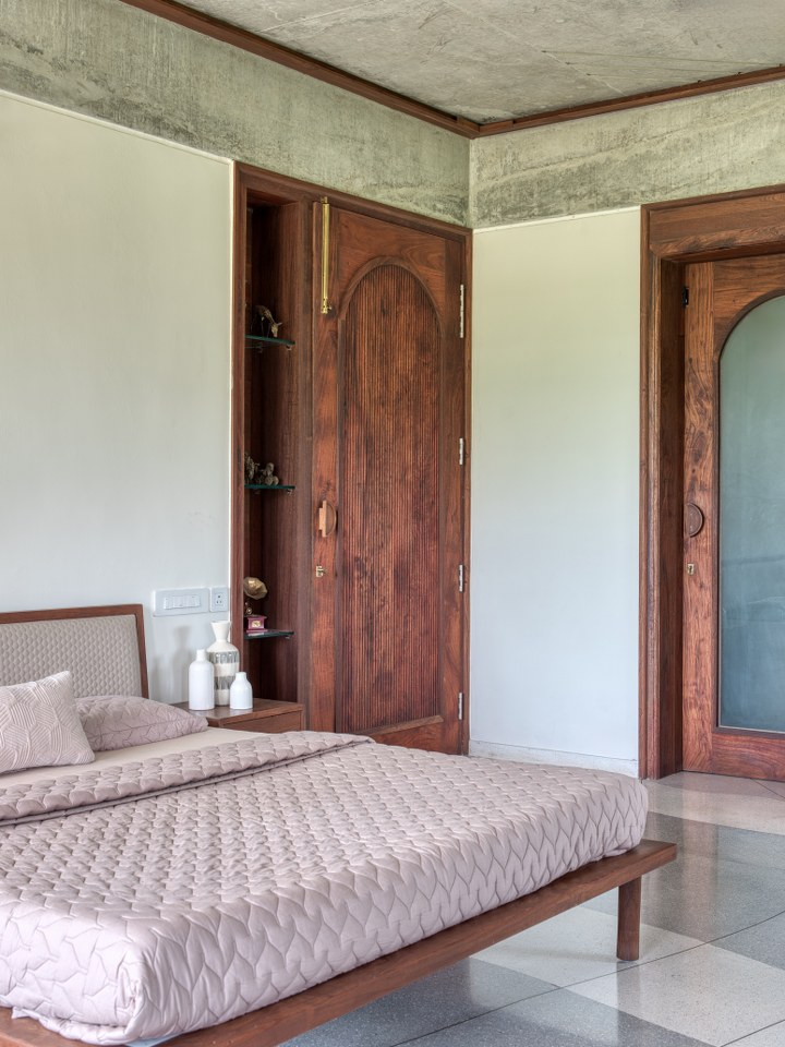 Subtle and authentic material engagement is a spirit of expression through the use of light tones and rich textures of exposed RCC in bedrooms. Terrazzo flooring anchors the space and provides complimentary bond between walls and wooden openings. Creating a space where his love for art can find quiet moments of expression.